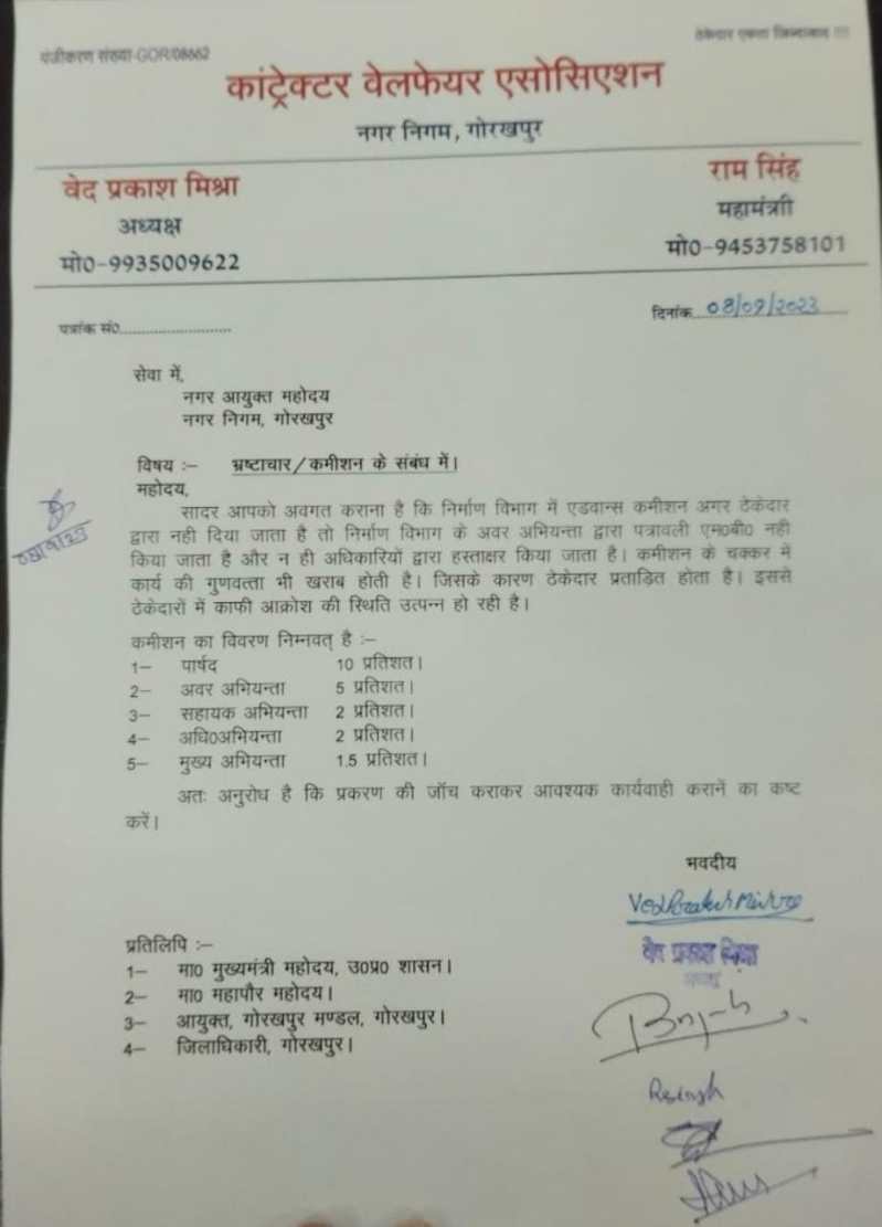 Gorakhpurnews : नगर निगम के ठेकेदार वेलफेयर एसोसिएशन के द्वारा लिखकर नगर आयुक्त को एक प्रार्थना पत्र दिया गया है जिसमें नगर निगम में चल रही रिश्वतखोरी के बारे में जानकारी दी गई है। इस चिट्ठी में क्रम से सभी कर्मचारी व अधिकारियों के रिश्वतखोरी का डिटेल्स दर्ज किया गया है। इस चिट्ठी में सबसे मजेदार बात तो यह है कि नगर निगम के कर्मचारी व अधिकारियों के साथ इसमें सबसे ज्यादा कमीशन पार्षद को देना बताया गया है। सवाल यह है की अगर इतना कमीशन देकर कोई भी ठेकेदार काम लेगा तो फिर उस काम में कितनी गुणवत्ता दे पाएगा, कितना धन उसे इस काम में प्रॉफिट मिलेगा। यह वायरल चिट्ठी ठेकेदारों का दर्द भी बता रही है की किस तरह उनके परिवार का भरण पोषण होगा जब इस हद तक कमीशनबाजी चल रही है। फिलहाल यह पत्र नगर निगम में चर्चा का विषय बना हुआ है, इस पत्र द्वारा नगर आयुक्त को फैले भ्रष्टाचार से अवगत भी कराया गया है।