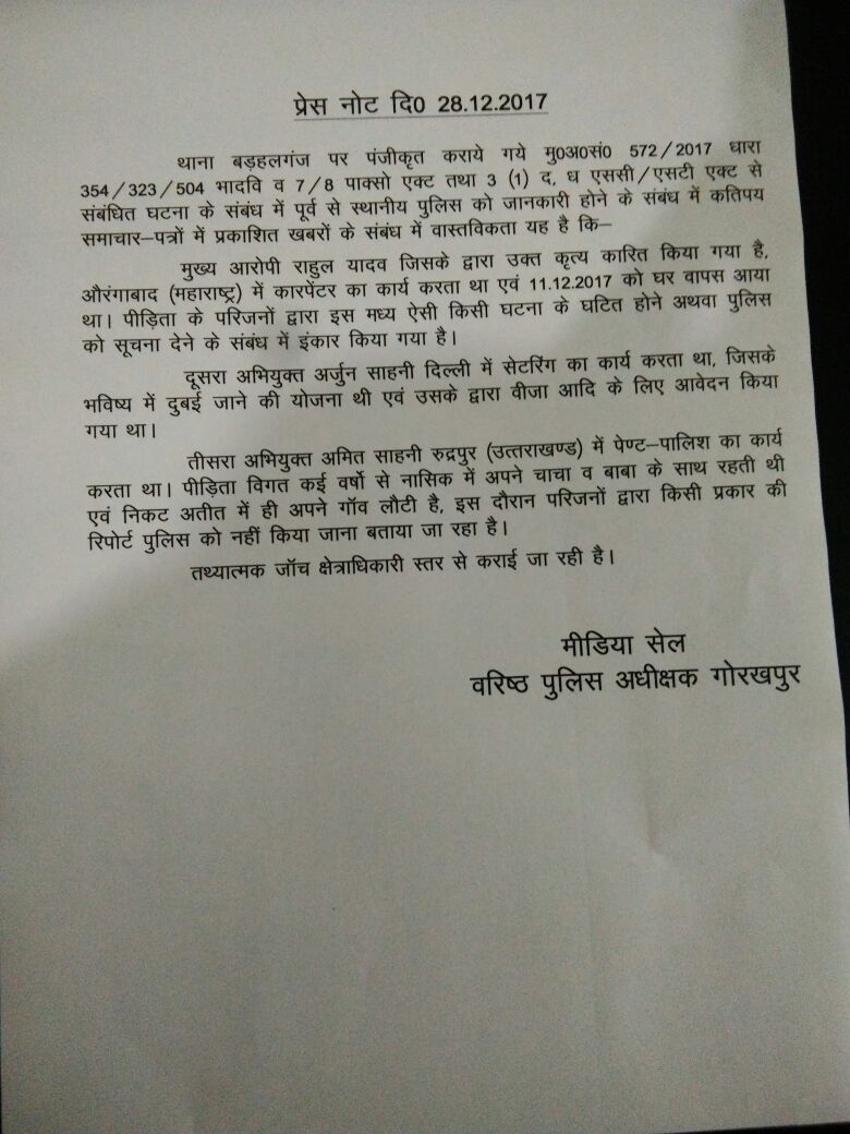 एसएसपी गोरखपुर के मीडिया सेल ने प्रेसनोट जारी कर बताया है कि बड़हलगंज में किशोरी के मामले में आरोपियों के खिलाफ केस दर्ज कर लिया गया है। लेकिन पीड़ित परिजन द्वारा किसी प्रकार की रिपोर्ट पूर्व में पुलिस को नहीं की गई थी। प्रेसनोट के अनुसार मुख्य आरोपी राहुल यादव औरंगाबाद में कारपेंटर का काम करता है। 11 दिसम्बर को वह घर आया हुआ है। दूसरा आरोपी अर्जुन दिल्ली में सेटरिंग का काम करता है और दुबई के लिए वीजा अप्लाई किया हुआ है। तीसरा आरोपी उत्तराखंड के रूद्रपुर में पेंट पालिश का काम करता था। पुलिस ने यह भी बताया है कि पीड़िता खुद अपने चाचा व बाबा के साथ नासिक में रहती थी। जल्द ही वह गांव लौटी है।
