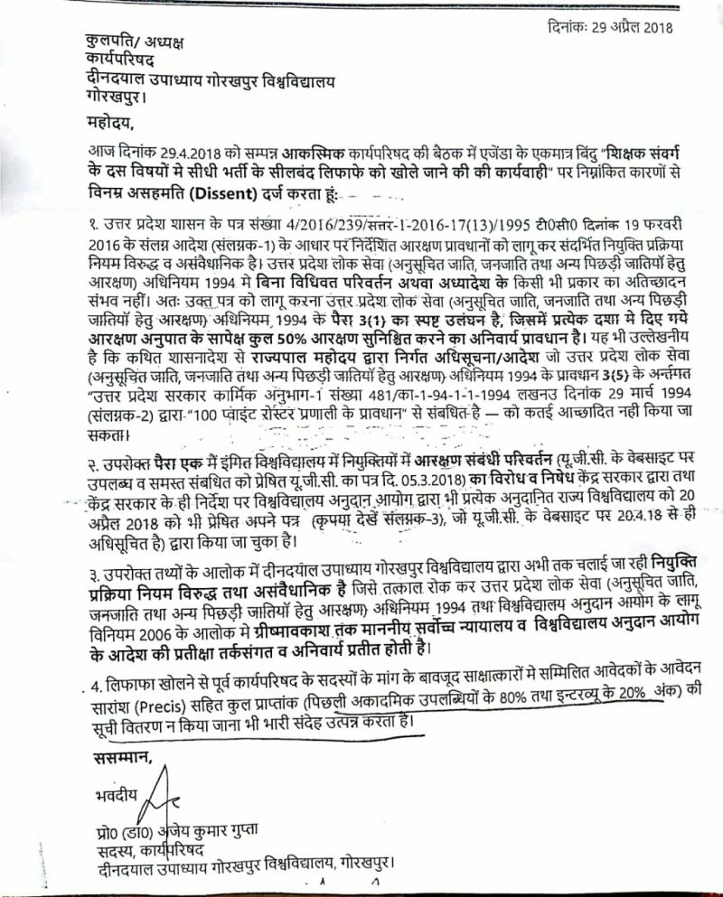 उधर, नियुक्त शिक्षकों का लिफाफा खुलने के पूर्व ही कार्यपरिषद के एक सदस्य प्रो.अजेय कुमार गुप्ता ने लिखित रूप से कुलपति को अपने मत से अवगत कराकर नियुक्ति प्रक्रिया पर सवाल खड़े कर दिए। प्रो.गुप्त ने लिफाफा खुलने के पहले ही अपनी असहमति कुछ बिंदुओं पर जताई। प्रो.गुप्त के अनुसार नियुक्ति प्रक्रिया में संविधान द्वारा प्रदत्त नियमों के तहत आरक्षण प्रक्रिया का पालन नियमानुसार नहीं किया गया है। यही नहीं विवि की नियुक्ति के पहले ही यूजीसी ने आरक्षण के संबधित एक सर्कुलर जारी किया है। इसको भी दरकिनार कर दिया गया है। जबकि केंद्र सरकार ने भी इस बाबत एक निर्देश जारी किया गया है। आरक्षण से संबंधित आदेशों की अवहेलना के साथ साथ पूरी प्रक्रिया पर भी प्र्रो.अजेय कुमार गुप्ता ने सवाल खड़े किए हैं। उन्होंने पत्र में कहा है कि लिफाफा खोलने के पहले साक्षात्कार में शामिल आवेदकों के आवदेन का सारांश, कुल प्राप्तांक, उनकी शैक्षणिक-अकादमिक उपलब्धियां का प्राप्तांक व इंटरव्यू का प्राप्तांक विविरण भी सार्वजनिक नहीं करना संदेह उत्पन्न करता है।