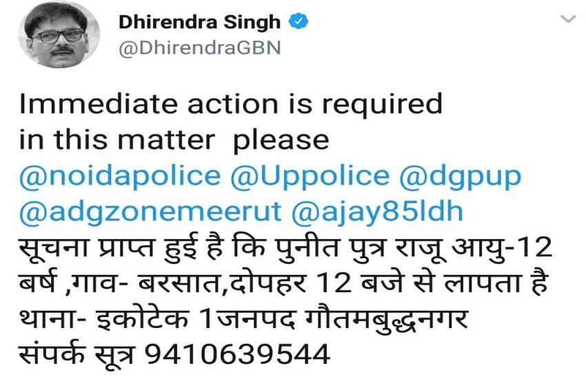 जानकारी के अनुसार बरसात गांव निवासी राजू नागर का 12 वर्षीय बेटा पुनीत अचानक गायब हो गया था। तलाश के बाद परिजनों को वह नहीं मिला तो मामले की तहरीर पुलिस को दी गई। पुलिस से पुनीत को जल्द से जल्द बरामद करने की गुहार लगाई गई। आरोप है कि तहरीर मिलने के बाद भी पुलिस ने कोई ठोस कार्रवाई नहीं की। पुलिस की तरफ से कोई कार्रवाई नहीं होने पर जेवर के विधायक ठाकूर धीरेंद्र सिंह से परिजनों ने संपर्क किया। जेवर के विधायक ठाकूर धीरेंद्र सिंह ने बताया कि उन्होंने कार्रवाई कराने को लेकर यूपी पुलिस, एडीजी जोन मेरठ, नोएडा पुलिस, पुलिस महानिदेशक, उत्तर प्रदेश शासन लखनउ और वरिष्ठ पुलिस अधीक्षक गौतमबुद्धनगर को ट्वीट किया।