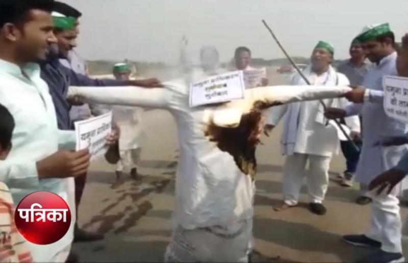 ग्रेटर नोएडा। जेवर एयरपोर्ट के लिए अधिग्रहित जमीन से मिले मुआवजे का किसान विरोध कर रहे हैं। पिछले सात दिन से धरने पर बैठे किसानों की महापंचायत में अधिकारियों वार्ता विफल हो गई थी। जिसके बाद किसानों ने किसान एकता संघ के बैनर तले प्रदर्शन किया और दनकौर थाना क्षेत्र के सेक्टर 18 में पुतला फूंका।