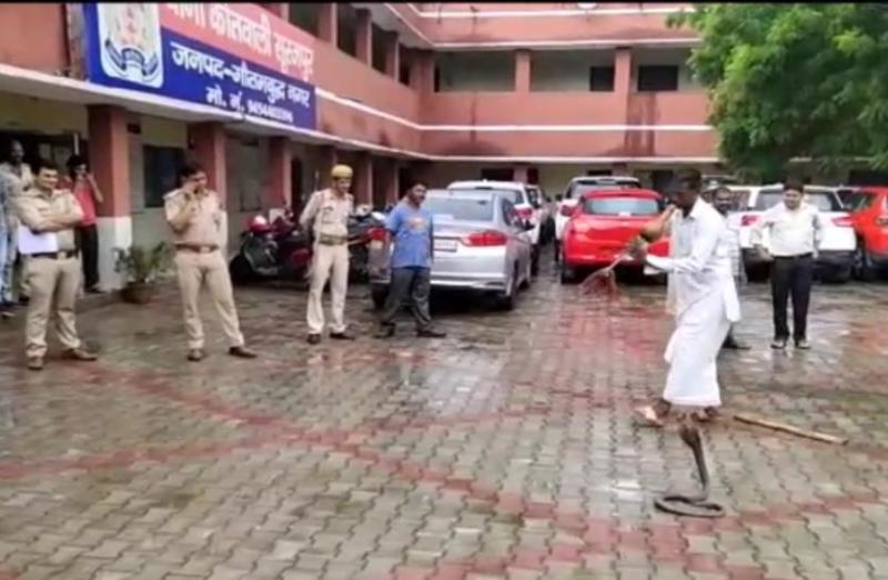 ग्रेटर नोएडा। सांप का नाम सुनते ही जिस्म में सिहरन दौड़ जाती है,ऐसे में अगर सांप आपके सामने आ जाए तो अंदाजा लगाया जा सकता है कि किसी भी हालत कैसी होगी। ऐसी ही घटना ग्रेटर नोएडा के कोतवाली सुरजपुर ( surajpur police ) में घटित हुई, जब दस फीट का जहरीला किंग कोबरा ( king kobra ) सांप दिखने के बाद हड़कंप मच गया। देखते–देखते लोगों का हुजूम इक्कठा हो गया। बड़े–बड़े अपराधियों को दबोचने वाली पुलिस सांप को पकड़े में सफल नहीं हो पाई। जब पुलिस बेबस नजर आई तब सपेरा बुलाया गया और तब जाकर सांप से निजात मिल पाई।