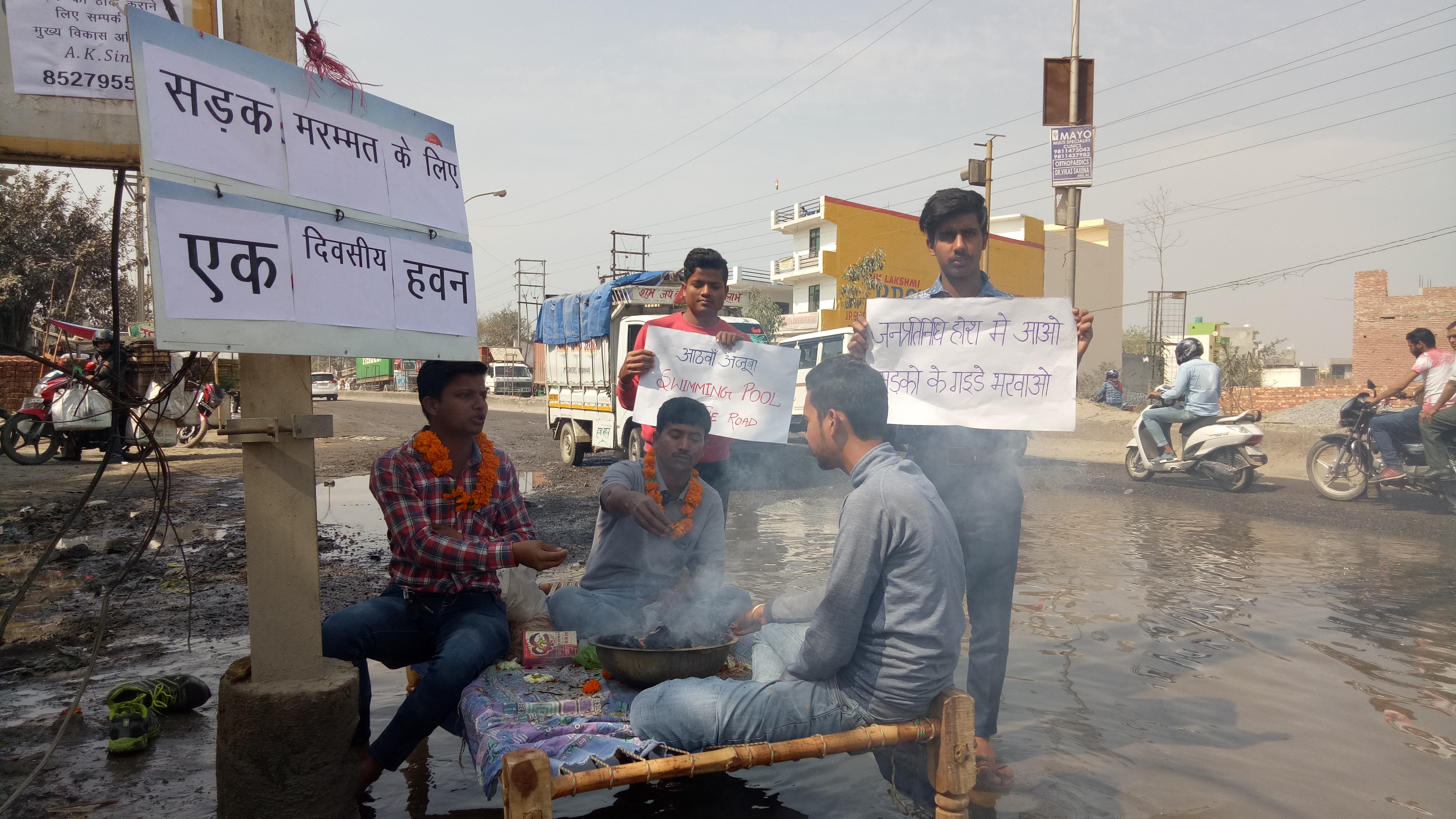 ग्रेटर नोएडा. योगी सरकार के गड्ढेमुक्त सड़क बनाने के दावे खोखले साबित हो रहे है। योगीराज में गड्ढामुक्त सड़क के खोखले दावे को देखते हुए लोगों ने अब गांधीगिरी का रास्ता अपनाना पड़ रहा है। दादरी-छलेरा-सूरजपुर रोड पर गड्ढेे होने की वजह से लोग परेशान है। आए दिन गाड़ियां गड्ढों में फंस जाती है। जिसकी वजह से घंटों ट्रैफिक बाधित होता है। सूरजपुर के रहने वाले लोगों की माने तो काफी समय से दिक्कत हो रही है। ग्रेटर नोएडा अथॉरिटी और जिला प्रशासन के अफसर शिकायत करने के बाद भी कोई ठोस कदम नहीं उठा रहे है। गड्ढों से निजात पाने के लिए सूरजपुर के लोगों ने रोड पर चारपाई रखी और उसपर बैठकर हवन किया। ऐसा ग्रेटर नोएडा अथॉरिटी और जिला प्रशासन के अफसरों का सड़क की तरफ ध्यान खींचने के लिए किया गया।