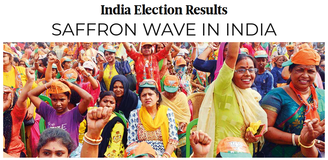 नई दिल्ली।लोकसभा चुनाव 2019 के परिणाम के लिए मतों की गिनती शुरू हो गई है और शुरुआती रूझानों के मुताबिक भाजपा प्रचंड बहुमत के साथ सत्ता में वापसी कर रही है। भारतीय चुनाव परिणाम को लेकर देश-दुनिया के लोग टकटकी लगाकर देख रहे हैं। इतना ही नहीं विदेशी मीडिया में भी चुनाव परिणाम को लेकर चर्चाएं हैं। जिस तरह से शुरूआती रूझानों के अनुसार पूरा देश भगवामय नजर आ रहा है वैसे ही गल्फ देशों की मीडिया भी भगवा रंग में रंगा नजर आ रहा है। जीत की ओर आगे बढ़ते नरेंद्र मोदी और कांग्रेस की हार को लेकर 'गल्फ न्यूज' खास रिपोर्ट पेश की है।