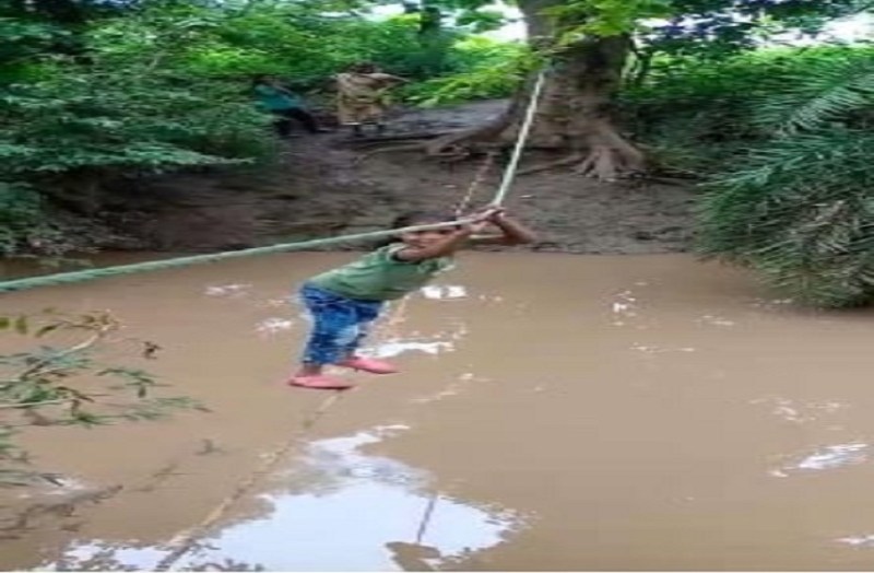 रस्सी के सहारे नदी पार कर स्कूल जाने को मजबूर बच्चे