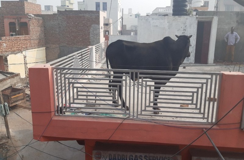 दो घंटे की मशक्कत के बाद छत से उतरा सांड