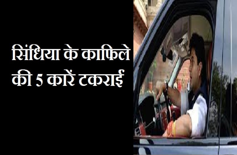 'ग्वालियर गौरव दिवस' के लिए ग्वालियर आए केन्द्रीय मंत्री ज्योतिरादित्य सिंधिया के कारकेड में रविवार को एक बार फिर हादसा हो गया। उनके काफिले में दौड़ रहीं 5 गाडिय़ां आपस में टकरा गईं। हालांकि घटना गंभीर नहीं हुई, लेकिन गाडिय़ों में टूट-फूट हुई है। इनमें पुलिस की गाड़ी भी शामिल है।