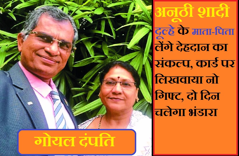 बेटे और बेटी की शादी का सपना हर मां बाप का होता है, जिसे उत्साहपूर्वक करने वह अपने जीवन की जमा पूंजी लगा देते हैं। मां-बाप का पूरा फोकस अपने रिश्तेदारों की खातिरदारी तक ही सीमित रह जाता है, लेकिन शहर में एक गोयल फैमिली एेसी भी है जिसने न सिर्फ बेटे की शादी में शहर के हर वर्ग को शरीक करने का प्लान बनाया, बल्कि खुद इस ओकेजन पर देहदान करने का संकल्प भी लिया। यानि बेटे के फेरे के सात वचन के साथ दूल्हे के माता-पिता देहदान का संकल्प लेंगे। बिजनेसमैन सुनील गोयल के बेटे साहिल की शादी 29 अप्रैल को ऊषा किरण पैलेस से होगी। इस अनोखी शादी में सात फेरे लेने के साथ ही माता-पिता देहदान का शपथ पत्र भी भरेंगे।