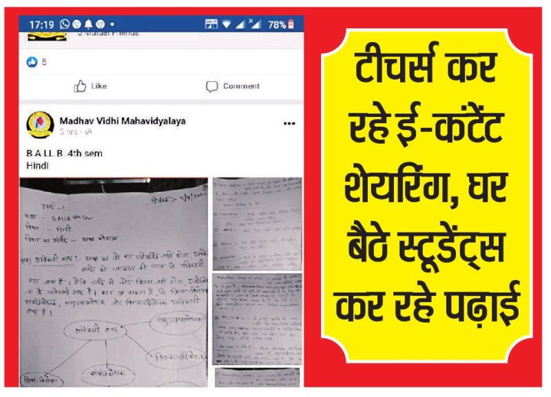 ग्वालियर. माधव विधि महाविद्यालय के स्टूडेंट्स घर बैठे ही ऑनलाइन पढ़ाई कर रहे हैं। महाविद्यालय के टीचर्स ऑनलाइन वीडियो, ऑनलाइन वर्कशीट का प्रयोग कर विभिन्न एप्स के माध्यम से छात्र-छात्राओं को पढ़ा रहे है। जाहिर है कि कोरोना वायरस के कारण लॉकडाउन की स्थिति में स्टूडेंट्स की पढ़ाई पर प्रतिकूल असर नहीं पड़े, जिसको लेकर महाविद्यालय ने यह व्यवस्था की है। महाविद्यालय में पढ़ने वाले ज्यादातर विद्यार्थी शहर से हैं। वह अपने घर पर ही सुरक्षित रहकर पढ़ाई कर सकें, इसी उद्देश्य को साकार करने के लिए महाविद्यालय के अध्यापकों द्वारा निर्धारित समयसारिणी के अनुसार प्रतिदिन ऑनलाइन लेक्चर्स के साथ-साथ नोट भी दिए जा रहे हैं।