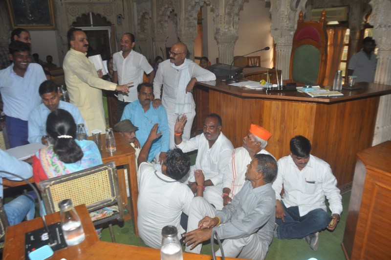 परिषद की कार्रवाई शुरू होते ही पार्षद बृजेश गुप्ता ने हंगामा करते हुए कहा कि 4 महीने पहले उनके यहां पानी की लाइन डालने के लिए खुदाई तो कर दी, लेकिन अभी तक पाइप नहीं डाले हैं। उन्होंने आसंदी घेर ली और वहीं धरने पर बैठ गए। उनके साथ पुरुषोत्तम टमोटिया, सुरजीत सिंह भदौरिया, जय सिंह सोलंकी आदि पार्षद भी बैठ गए और कहा कि जब तक कार्य नहीं हो जाता वह धरने से नहीं उठेंगे। हंगामा बंद नहीं हुआ तो पैनल सभापति दिनेश दीक्षित ने बैठक 10 मिनट के लिए स्थगित कर दी। बैठक पुन: शुरू होने पर काफी समझाने के बाद पार्षदों ने धरना खत्म किया। सभापति ने प्रभारी आयुक्त आरके श्रीवास्तव को निर्देश दिए कि वह पार्षदों से चर्चा कर उनके क्षेत्र में जाएं और समस्या का निराकरण करें।