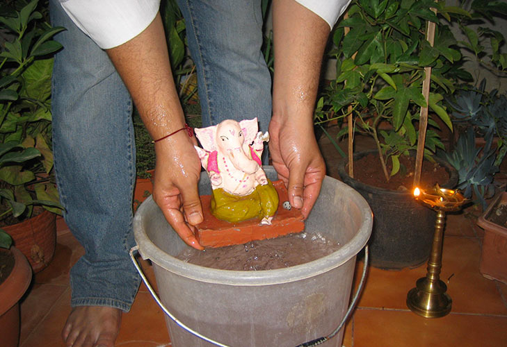 - मिट्टी घुलने के बाद पानी को गमलों में डाल दें। मूर्ति बड़ी है तो प्रशासन द्वारा नियत स्थान अथवा कुण्ड में विसर्जन करें।