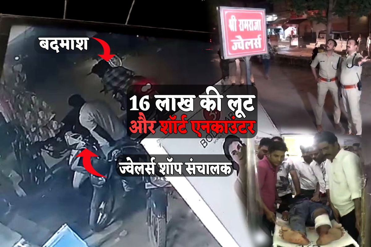 Jewellery Shop Owner Loot :मध्य प्रदेश के ग्वालियर में लूट की वारदातें थमने का नाम नहीं ले रहे हैं। सोमवार रात को शहर के महाराजपुर इलाके के कुशवाहा बाजार में स्थित रामराज ज्वेलर्स शॉप के संचालक के साथ लूट की सनसनीखेज वारदात हुई। बाइक पर सवार होकर आए तीन बदमाशों ने ज्वेलर्स संचालक के बेटे को गोली मारकर उससे एक बैग छीनकर फरार हो गए। पैर में गोली लगने से युवक घायल गुआ है। उसने पुलिस को बताया कि बैग में 200 ग्राम सोना और 1 लाख रुपए रखे थे। इधर, सनसनीखेज लूटकांड का एक सीसीटीवी भी सामने आया, जिसमें वारदात कैद हुई। हालांकि, घटना के बाद मुस्तैद हुई पुलिस ने तड़के तक तीनों बदमाशों को दबोच लिया। वहीं, घेराबंदी के दौरान बदमाशों ने पुलिस पर भी फायरिंग शुरु कर दी। मुठभेड़ में मुख्य आरोपी का शॉर्ट एनकाउंटर कर पुलिस ने तीनों को दबोच लिया है।