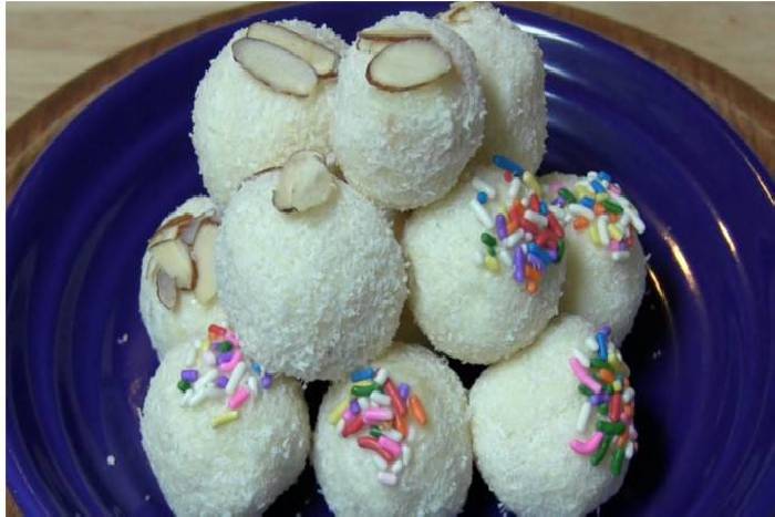 विधि : एक बाउल में चीनी की चाशनी बनाकर अलग रखेेंं। मावे को कढ़ाई में हल्का गुलाबी होने तक भूनें। गैस बंद कर मावे को हल्का ठंडा होने दें। इसमें कद्दूकस किया हुआ नारियल (कोटिंग के लिए थोड़ा पाउडर बचा लें), चाशनी, सूखे मेवे व इलायची पाउडर को मिला लें। थोड़े-थोड़े मिश्रण को हथेली पर लेकर लड्डू बनाएं। एक अलग प्लेट में नारियल पाउडर लेकर लड्डुओं की कोटिंग करें। इन्हें १० दिन तक फ्रिज में रख सकते हैं।