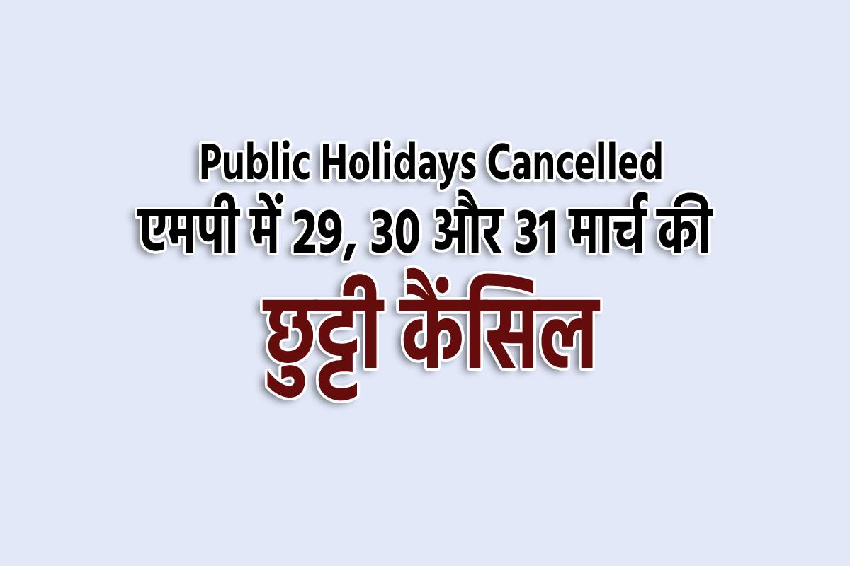 एमपी के पंजीयन विभाग में तो मार्च माह में अवकाश निरस्त कर दिए गए हैं। शनिवार, रविवार के सार्वजनिक अवकाश में भी पंजीयन का काम करना पड़ रहा है। कुछ ऐसा ही हाल बिजली विभाग के कर्मचारियों का भी है। बिजली बिल भुगतान में लगे कर्मचारियों के लिए तीन दिन के अवकाश निरस्त कर दिए गए हैं। मध्य क्षेत्र विद्युत वितरण कंपनी ने कहा है कि सभी जोनल कार्यालय और बिजली बिल भुगतान केन्द्र खुले रहेंगे। मार्च के अंतिम दिनों में अवकाश के दिनों में भी सामान्य रूप से कामकाज किया जाएगा। कंपनी के अंतर्गत 16 जिलों में ये अवकाश निरस्त किए गए हैं।