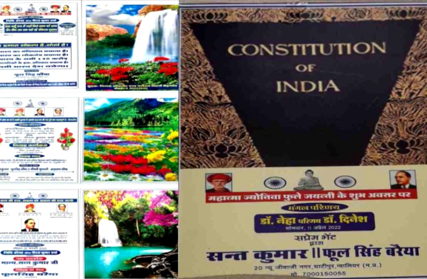मध्य प्रदेश के ग्वालियर में कांग्रेस नेता फूल सिंह बरैया अपने बयानों को लेकर हमेशा चर्चा में बने रहते हैं। इस बार फिर वो अपनी बेठी शादी के लिए बांटे जाने वाले इनविटेशन कार्ड को लेकर चर्चा में आ गए हैं। यानी इस बार की चर्चा राजनीतिक कारणों के चलते नहीं, बल्कि पारिवारिक कारणों के चलते है। दरअसल, फूल सिंह बरैया के घर में मांगलिक कार्यक्रम है। बरैया की बेटी की शादी हो रही है, जिसके चलते उन्होंने आमंत्रण पत्र छपवाए हैं। खास बात ये है कि, इस आमंत्रण पत्र को उन्होंने संविधान की रक्षा की थीम पर तैयार करवाया है।