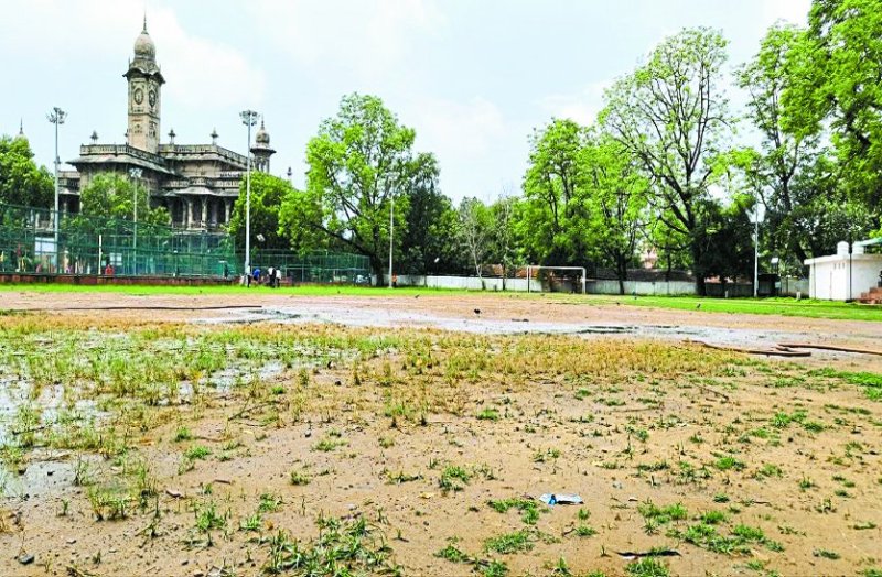 बारिश में एमएलबी कॉलेज मैदान की घास गायब मैदान का लेवल सही नहीं होने से भर गया है पानी