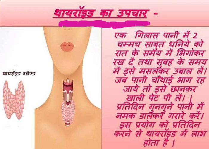 साबुत धनिये का उपयोग : एक गिलास पानी में 2 चम्मच साबुत धनिये को रात के समय में भिगोकर रख दें तथा सुबह के समय में इसे मसलकर उबाल लें। फिर जब पानी चौथाई भाग रह जाये तो खाली पेट इसे पी लें तथा गर्म पानी में नमक डालकर गरारे करें। यह उपचार लगातार करने से थायरायड की समस्या से छुटकारा मिल सकता है।