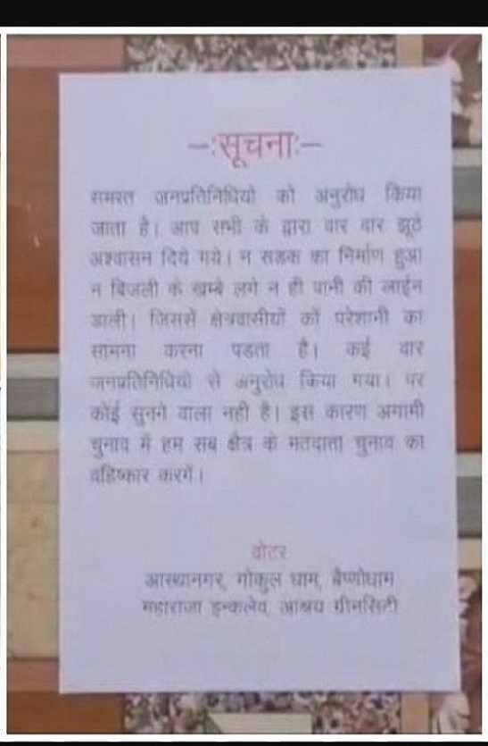कांग्रेस छोड़कर भाजपा में जाने वाले ग्वालियर पूर्व विधानसभा के पूर्व विधायक मुन्नालाल गोयल से क्षेत्र के मतदाता नाराज हैं। इन सभी कॉलोनियों में फौजियों के परिवार रहते है। मतदाताओं ने अपने घर के बाहर लगाए पोस्टर पर लिखा है कि समस्त जनप्रतिनिधियों से अनुरोध है कि आप सभी के द्वारा बार बार झूठे आश्वासन दिए गए। न सड़क का निर्माण हुआ न बिजली के खंबे लगे न ही पानी की लाइन डली। कई बार जन प्रतिनिधियों से अनुरोध किया गया पर कोई सुनने वाला नहीं है। इस कारण आगामी चुनाव में हम सभी क्षेत्र के मतदाता चुनाव का बहिष्कार करेंगे। अंत में लिखा है वोटर, आस्था नगर, गोकुल धाम, वैष्णो धाम, महाराज इंक्लेव, आस्था ग्रीन सिटी।