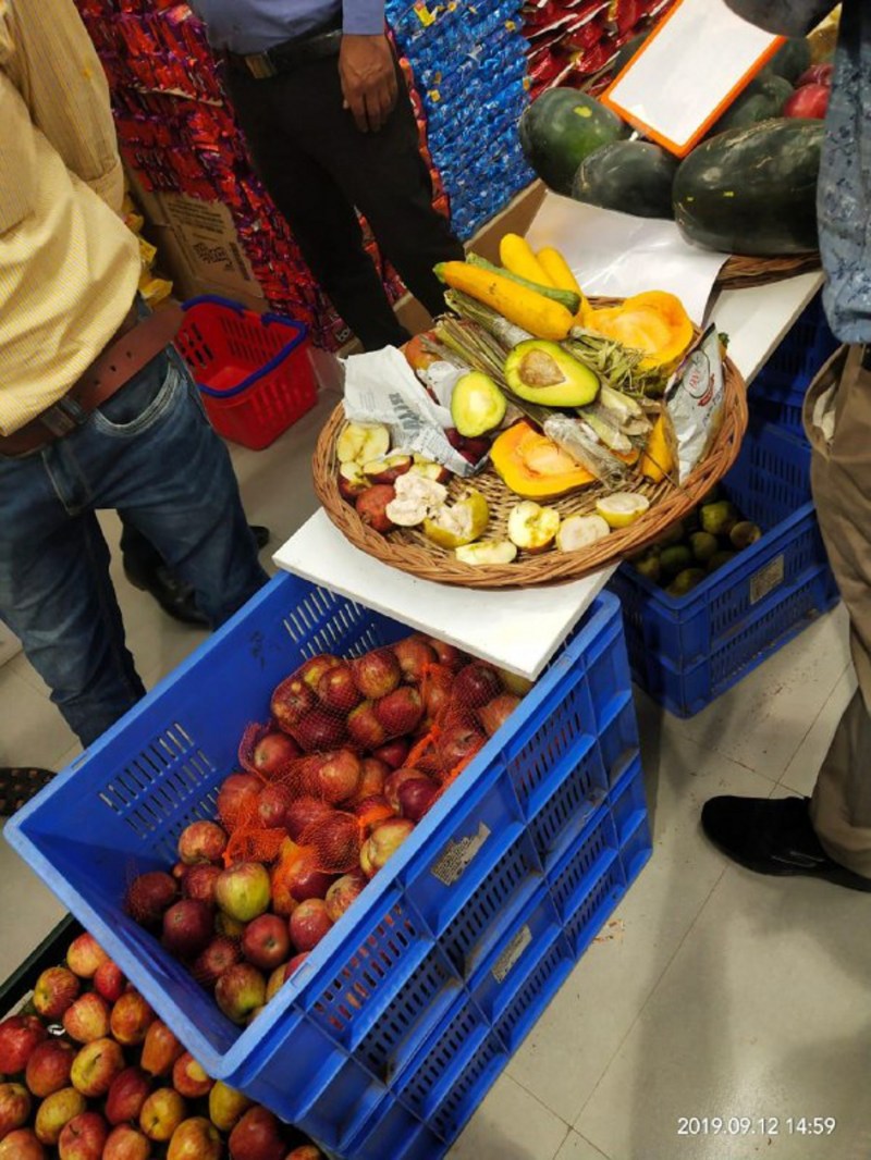 खाद्य सुरक्षा अधिकारी निरुपमा शर्मा के नेतृत्व में पहुंची टीम ने डीबी मॉल स्थित बिग बाजार में फलों और सब्जियों की जांच-पड़ताल की। यहां मौजूद मैनेजर और एडमिन अमित श्रीवास्तव से जब खाद्य विभाग के अधिकारियों ने पूछा कि ऐसे सड़े-गले फलों की बिक्री क्यों की जा रही है और ये बिकने के लिए यहां कैसे आ गए, तो वह कोई संतोषजनक जवाब नहीं दे पाए। टीम ने यहां बिक्री के लिए उपलब्ध हिमाचल और ग्रीन सेब पर से मोम की कोटिंग को हटाया और उनका सैंपल भी लिया गया। यहां मिले सेब पर लेबल भी चिपकाए हुए थे लेकिन उन पर भी मोम की कोटिंग का उल्लेख नहीं था। इसके साथ ही करीब 4 किलो सेब, दो किलो अमरूद के साथ सब्जियां जो सड़ी-गली अवस्था में थी, नष्ट करवा दिए। टीम में नायब तहसीलदार वंदना यादव, एफएसओ सतीश धाकड़, सतीश कुमार शर्मा, लखनलाल कोरी, लोकेन्द्र आदि शामिल थे।