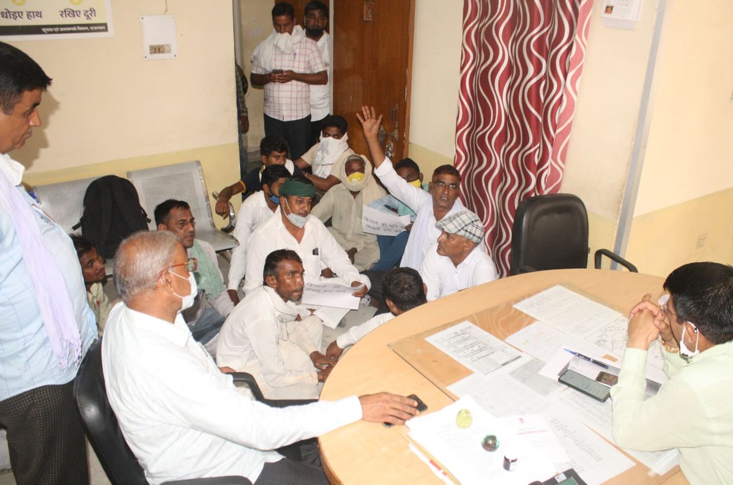 हनुमानगढ़. बैंकों की कर्ज वसूली के लिए सोमवार को हनुमानगढ़ तहसीलदार कार्यालय में प्रस्तावित कृषि भूमि नीलामी प्रक्रिया संयुक्त किसान मोर्चा सदस्यों के विरोध के चलते स्थगित करनी पड़ी। इसकी पहले ही घोषणा कर दी गई थी। सोशल मीडिया पर संयुक्त किसान मोर्चा कार्यकर्ताओं ने चेतावनी भी जारी कर दी थी कि किसानों की जमीन नीलामी में खरीदने के लिए सोच-समझकर जाए। जैसे ही नीलामी की प्रक्रिया प्रारंभ की गई रघुवीर वर्मा व जगजीतसिंह जग्गी के नेतृत्व में कार्यकर्ता तहसीलदार कार्यालय में घुस गए तथा धरना शुरू कर दिया। विरोध प्रदर्शन करते हुए कहा कि भूमि नीलामी नहीं होने दी जाएगी। कार्यालय में काफी देर तक नारेबाजी चलती रही। इस दौरान किसानों की भीड़ मौके पर बढ़ती गई। एसडीएम अवि गर्ग ने भरोसा दिलाया कि लघु व सीमांत किसान की भूमि नीलामी नहीं होगी।