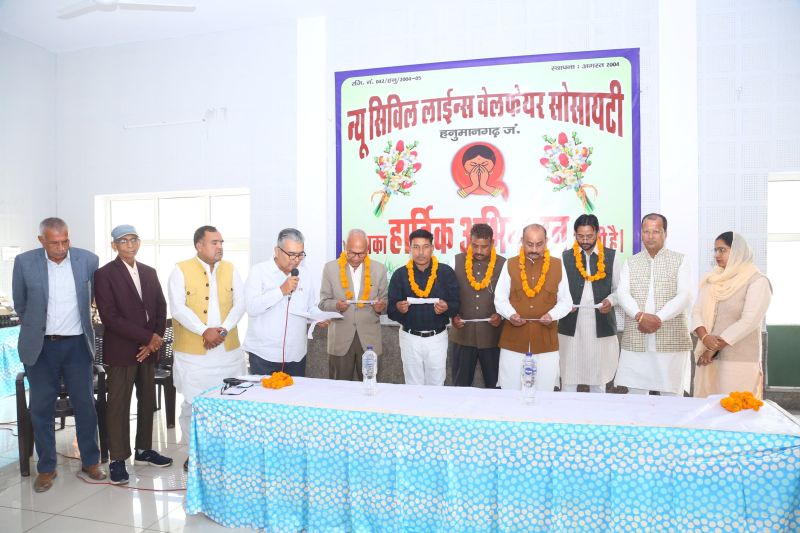 कार्यक्रम की अध्यक्षता न्यू सिविल लाइन वेलफेयर सोसायटी के नवनियुक्त अध्यक्ष मोहनलाल इंदलिया ने की। इस दौरान अतिथियों ने नई कार्यकारिणी के अध्यक्ष मोहनलाल इंदलिया, उपाध्यक्ष भीमसेन शर्मा, महासचिव प्रेम सिंह राघव, कोषाध्यक्ष संदीप बिश्नोई ,सहसचिव राजेश कुमार असीजा, संगठन मंत्री महेंद्रपाल को पद की गरिमा एवं गोपनीयता की शपथ दिलाई। कृषि विपणन विभाग के उप निदेशक डीएल कालवा, शिक्षाविद् डॉ. संतोष राजपुरोहित, न्यू सिविल लाइन सोसायटी के अशोक गांधी, रमेश दरगन, प्रेम सिंह, राजेंद्र जोशी, खेतपाल बिश्नोई, ओपी थापन, दयाराम डोटासरा, बलवीर सिंह, डेयरी से सेवानिवृत्त एमडी एसपी सिद्धू आदि ने कार्यक्रम संचालन में सहयोग दिया। कार्यक्रम का संचालन सतीश कुमार शर्मा ने किया।