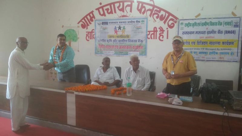 हनुमानगढ़. राष्ट्रीय कृषि एवं ग्रामीण विकास बैंक नाबार्ड एवं राजस्थान मरुधरा ग्रामीण बैंक शाखा फतेहगढ़ खिलेरी के सौजन्य से ग्राम पंचायत भवन फतेहगढ़ में वित्तीय डिजिटल एवं आजादी का अमृत महोत्सव शिविर का आयोजन किया गया। शिविर की अध्यक्षता बलराम खिलेरी ने की। वित्तीय साक्षरता समन्वयक लक्ष्मीनारायण कस्वां ने सामाजिक जीवन सुरक्षा बीमा योजनाओं की जानकारी दी। डिजिटल लेनदेन के तौर तरीकों के माध्यम से लेनदेन करने पर जोर िदया। शाखा प्रबंधक राकेश कुमार महला ने राजस्थान मरुधरा ग्रामीण बैंक के दिशा एप के बारे में जानकारी दी। इसके माध्यम से कोई भी ग्राहक अपने घर बैठे डिजिटली बचत खाता खोल सकता है। उन्होंने आगे बताया कि जिन कृषकों ने ऋण ले रखे हैं उसे समय पर उसकी अदायगी करनी चाहिए ताकि उनको ब्याज में होने वाली छूट का लाभ मिल सके। साथ ही सिबिल भी खराब ना हो और भविष्य में भी उनकी आवश्यकताओं के अनुरूप बैंक उनको आर्थिक मदद दे सके। शाखा प्रबंधक ने बताया कि साइबर ठगी के दिन प्रतिदिन मामले बढ़ रहे हैं। सभी को सावधान रहना चाहिए।