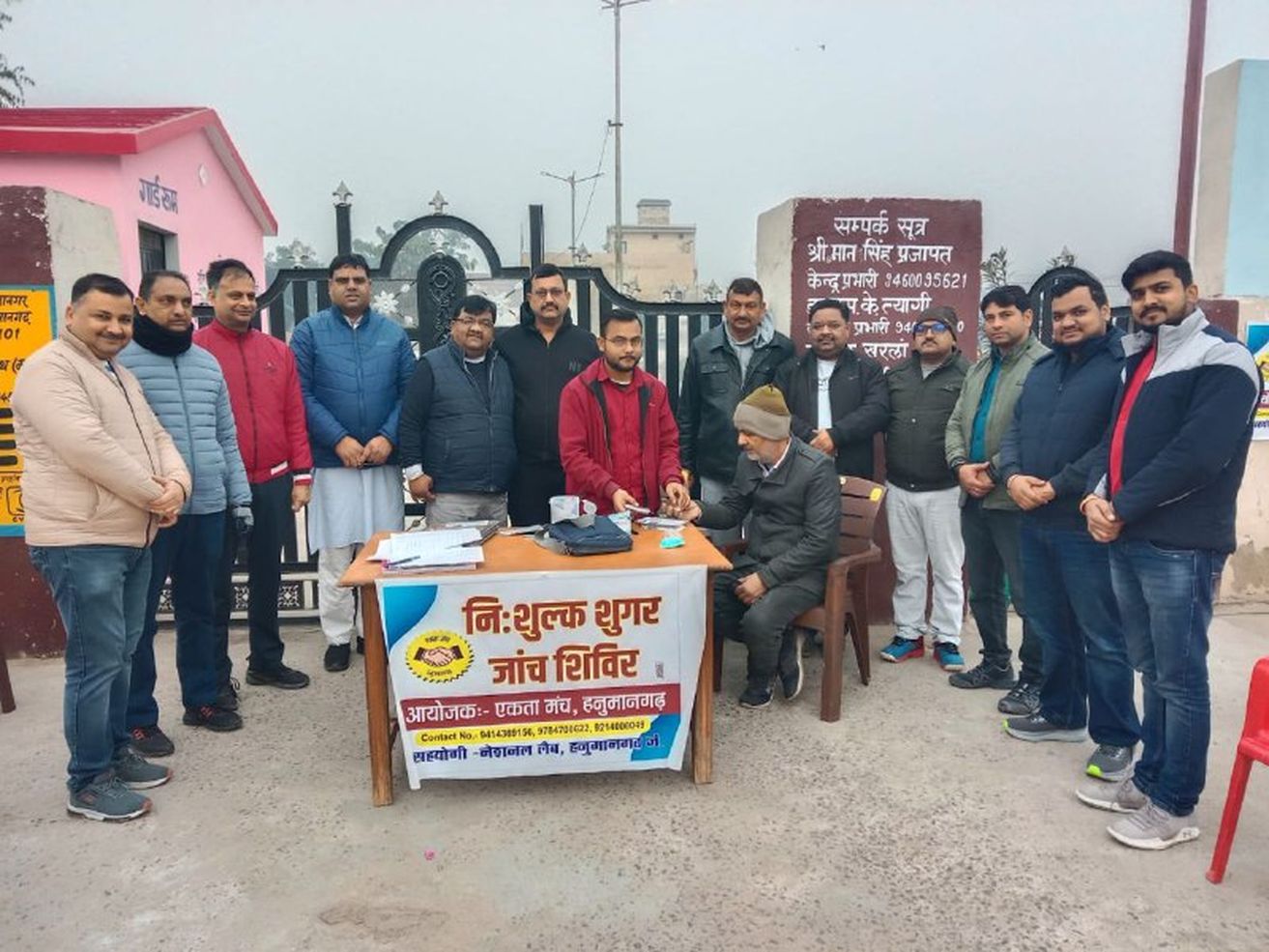 हनुमानगढ़. स्वयंसेवी संस्था एकता मंच हनुमानगढ़ की ओर से रविवार को जंक्शन की आवासन मंडल कॉलोनी स्थित सामुदायिक केंद्र में निशुल्क शुगर जांच शिविर लगाया गया। शिविर में 65 व्यक्तियों की निशुल्क शुगर जांच कर रिपोर्ट दी गई। एकता मंच ने मनुष्य की बदलती दिनचर्या और बढ़ते शुगर रोग के मध्यनजर जन जागरण अभियान चलाने का निर्णय किया है। इसी के तहत निशुल्क शुगर जांच शिविर लगाने का अभियान शुरू किया है। एकता मंच प्रत्येक रविवार को यह निशुल्क शुगर जांच शिविर लगाएगा। शिविर प्रत्येक रविवार वार्डवार आयोजित किए जाएंगे। अभियान की शुरुआत रविवार को जंक्शन की आवासन मंडल कॉलोनी से की गई। इस कार्य में हनुमानगढ़ जंक्शन की नेशनल लैब का सहयोग रहेगा।