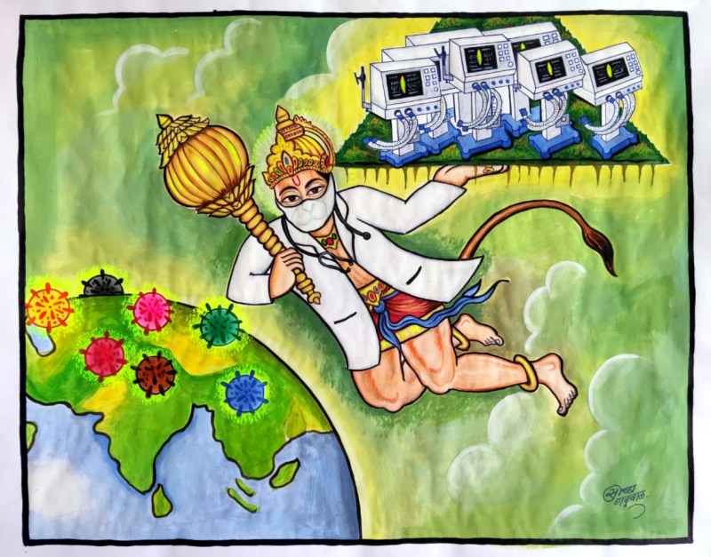 नगर के कलाकार ने कोरोना वायरस से जूझ रहे विश्व की स्थिति को ध्यान में रखते हुए हनुमान जयंती के उपलक्ष्य में चित्रकला के माध्यम से उम्दा प्रस्तुति दी है। पेंटर सुभाष गढ़वाल ने पेंटिंग बनाते हुए रामायण के उस दौर का चित्रण किया है जब हनुमानजी संजीवनी बूटी के लिए समूचा पहाड़ उठाकर ले आए थे। चित्रकाल में वही भाव रखते हुए वर्तमान आवश्यकता बताई है। इसमें एक ओर पृथ्वी पर कोरोना वायरस का प्रकोप बताया जा रहा है, वहीं दूसरी ओर हनुमानजी के हाथों में पहाड़ है, इसके उपर बहुत सारे वेंटीलेटर रखे है। हनुमानजी को डॉक्टर के रूप में बताया है। पेंटिंग का एक रूप यह भी है कि वर्तमान समय में चिकित्सक लोगों के लिए संकटमोचक बने हैं। कलाकर ने बताया कि वर्तमान में वेंटीलेटर ही संजीवनी बूटी है, इसकी देश को आवश्यकता है। ऐसी स्थिति में भगवान से प्रार्थना स्वरूप यह कलाकारी की गई है। जिस प्रकार लक्ष्मण को उन्होंने बचाया था, उसी प्रकार देश व विश्व को भी वे बचाएंगे।