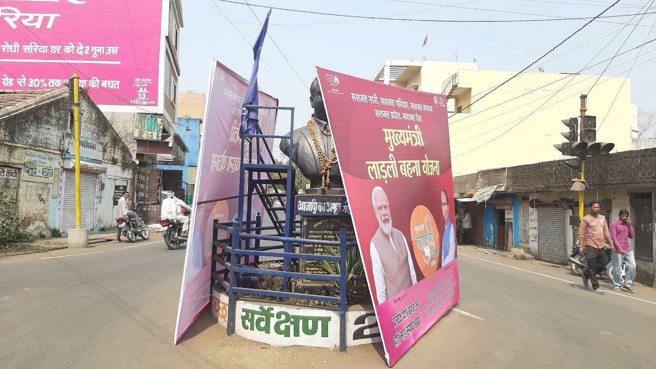 डॉ.भीमराव अंबेडकर चौराहे के पास संविधान निर्माता डॉ.अंबेडकर की नपा ने मूर्ति लगवाई है। यह शहर का व्यस्ततम चौराहा है। रविवार को यहां पर मूर्ति के दोनों ओर से योजना के प्रचार के होर्डिंग सुरक्षा रैलिंग के सहारे टिका दिए गए। यहां होर्डिंग लगाने से आज बाजू से मूर्ति का दिखना बंद हो गया।