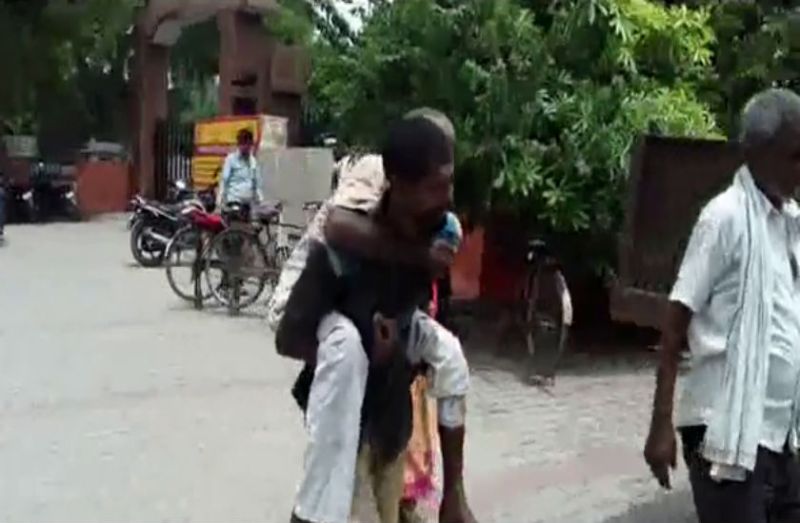 घायल पिता को कंधे पर लादे भटकता रहा बेटा, जिला अस्पताल में नहीं मिला स्ट्रेचर