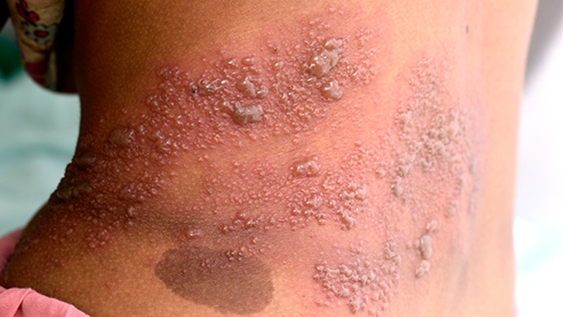 यह रोग आम तौर पर दाने के रूप में होता है, जिसमें छाती, पेट या चेहरे पर दर्दनाक फफोले होते हैं। दर्द को अक्सर जलन, चुभन या झटके जैसा बताया जाता है।