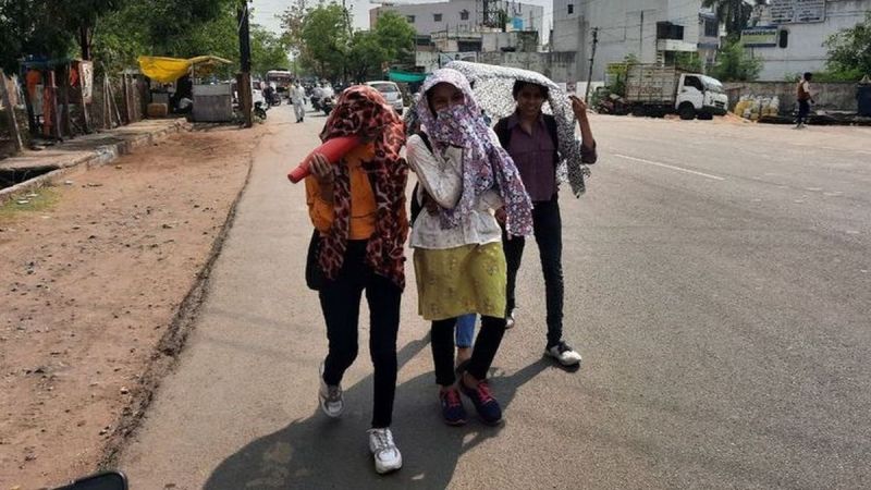 खंडवा. तेज धूप से बचने के लिए दुप्पटे का सहारा लेतीं छात्राएं।