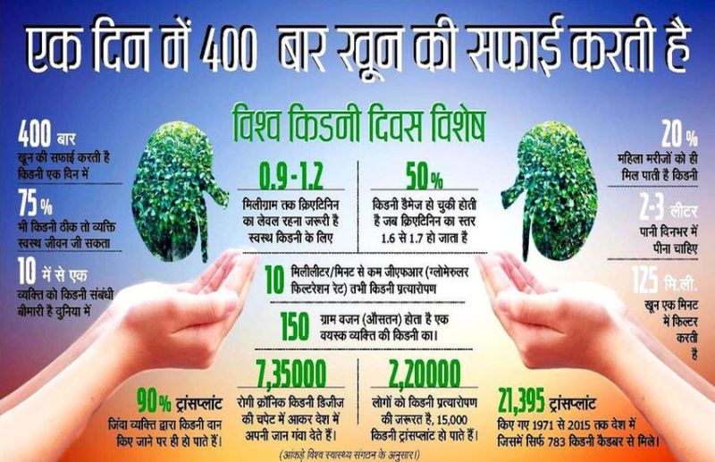 किडनी शरीर का अहम अंग है जिसे फंक्शन यूनिट भी कहते हैं। शरीर में दो किडनी (गुर्दे) होती है। किडनी लिवर के ठीक नीचे होती है। आंतरिक अंगों में सबसे बड़ी होती है। बाएं तरफ की किडनी दाहिनी की अपेक्षा छोटी होती है। किडनी में करीब 11 लाख नेफ्रॉन (रक्त को फिल्टर करने वाली जाली) होते हैं। किडनी की सेहत को लेकर प्रतिवर्ष मार्च के दूसरे गुरुवार को विश्व किडनी दिवस मनाते हैं। इस बार 14 मार्च यानी आज है। इसकी थीम ''दुनिया के हर कोने में सबकी किडनी रहे स्वस्थ'' रखी है।