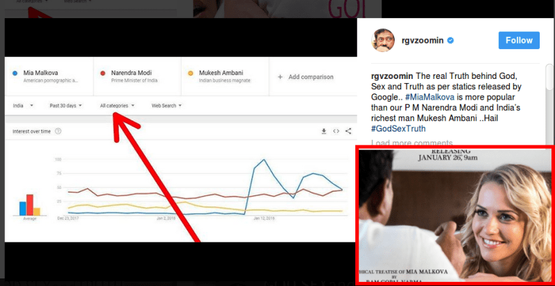 उनका दावा है कि पिछले 30 दिनों में मिया मालकोवा को देश में मोदी और अंबानी से ज्यादा सर्च किया गया। गूगल ट्रेंड्स (Google Trends) का ये स्क्रीनशॉट रामू ने 23 जनवरी को 12 बजकर 23 मिनट पर शेयर किया। रामू इस पोस्ट को शेयर कर शायद यह बताना चाह रहे हैं मिया मालकोवा अब बेहद लोकप्रिय हो गई हैं और उन्होंने देश के दो बड़े नामों को पछाड़ दिया है।