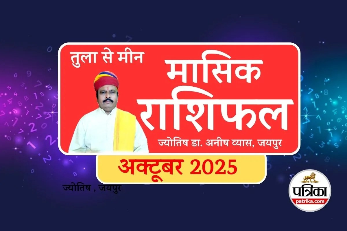 Masik Rashifal October 2025, मासिक राशिफल अक्टूबर 2025 : अक्टूबर 2025 मासिक राशिफल तुला से मीन राशि तक जातकों के लिए नए अवसर और चुनौतियां लेकर आया है। इस महीने करियर, कारोबार, प्रेम संबंध, स्वास्थ्य और धन से जुड़ी कई महत्वपूर्ण घटनाएं घटित हो सकती हैं। आइए जानते हैं ज्योतिषी डॉ. अनीष व्यास से तुला से मीन राशि तक अक्टूबर 2025 का विस्तृत राशिफल। (Monthly Horoscope October 2025)