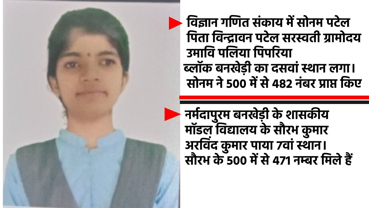 12 वीं में बनखेड़ी शासकीय स्कूल के सौरभ, सरस्वती सरस्वती ग्रामोदय उमावि की सोनम प्रदेश की टॉपर सूची में आए