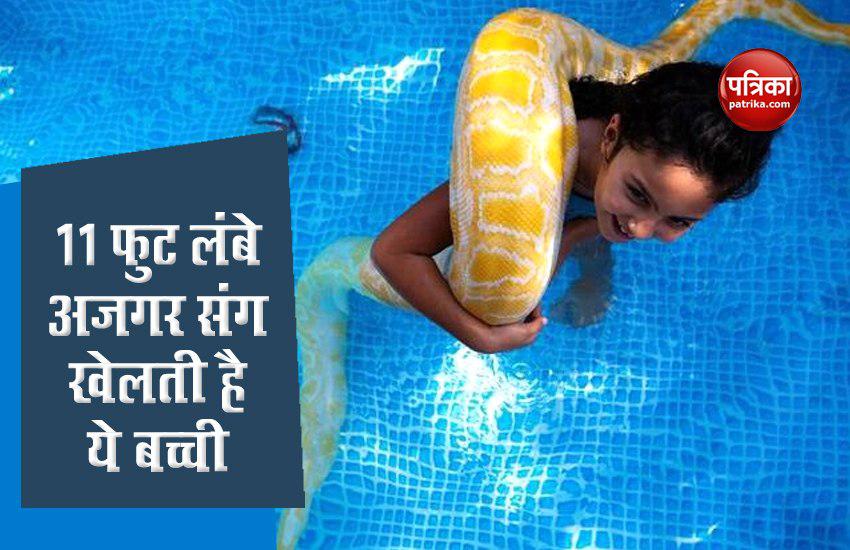 आमतौर पर बच्चे छोटी सी छिपकली को देखकर भी घबरा जाते है। अगर गलती से उनके सामने कोई बड़ा जानवर आए तो डर के मारे उनकी जान निकल जाती है। आज आपको 8 साल की मासूम बच्ची के बारे में बताने जा रहे है जो 11 फुट लंबे अजगर के साथ खेलती है। भले ही यह अजगर उनका पालतू जानवर है, लेकिन कई लोग यह नजारा देखकर हैरान रह जाते है। जी हां, हम इजरायल की 8 साल की इनबर की बात कर रहे है। इनबर अपने बैकयार्ड के छोटे से स्विमिंग पूल में अपने 11 फुट लंबे पीले रंग के दोस्त के साथ खूब मस्ती करती है। जिसकी तस्वीरें सोशल मीडिया पर खूब वायरल हो रही है।