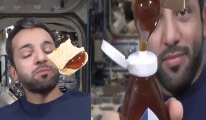अक्सर आपके मन में एक सवाल आता होगा कि अंतरिक्ष में जाने वाले लोग कैसे रहते होंगे। क्या खाकर उन्हें जिंदा रहना पड़ता होगा। इससे जुड़ा एक वीडियो सोशल मीडिया पर वायरल हो रहा है। दरअसल, संयुक्त अरब अमीरात के अंतरिक्ष यात्री अल नेयादी इस समय अंतरिक्ष मिशन पर गए हैं। यहां से वह लगातार अपनी तस्वीरें और वीडियो सोशल पर शेयर करते रहते हैं। हाल ही में उनकी वीडियो कॉन्फ्रेंसिंग के जरिये अपने बेटे से बातचीत का एक वीडियो सामने आया है। जिसमें अल नेयादी ब्रेड के साथ शहद खाते नजर आ रहे हैं।