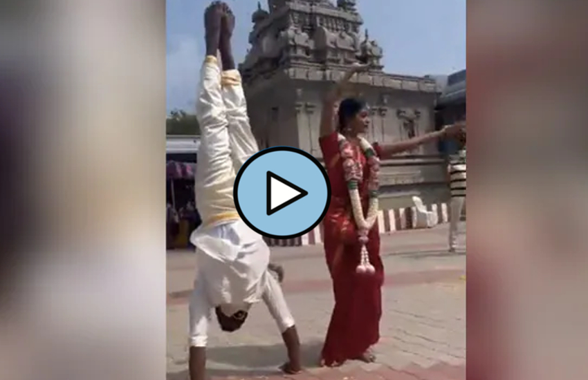 इस वीडियो में आप देख सकते है दुल्हन डांस करते हुए अपने दूल्हे के चारों ओर चक्कर लगा रही है। इस दौरान वह अलग अलग एंगल से पोज देती हुई नजर आ रही है। दुल्हन लगातार अपनी पोजीशन बदल रही है लेकिन दुल्हे राजा अपने हाथों के बल पर एक जगह खड़े है। यह अनोखा नजारा देखकर हैरान दंग है।