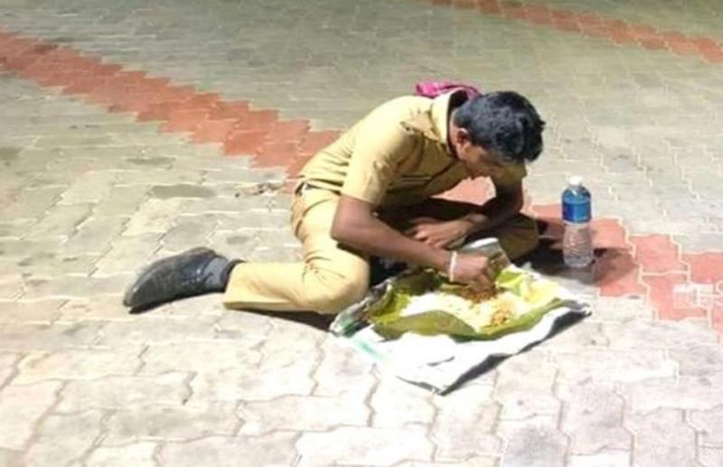 नई दिल्ली। सोशल मीडिया पर एक ‘पुलिसकर्मी’ की फोटो काफी तवायरल हो रही है। फोटो में पुलिसकर्मी जमीन पर बैठकर अकेले खाना खाता हुआ दिखाई दे रहा है। इस फोटो ने हर किसी के दिल को छू लिया और नतीजतन इसे इंटरनेट के जरिए जमकर शेयर किया गया।