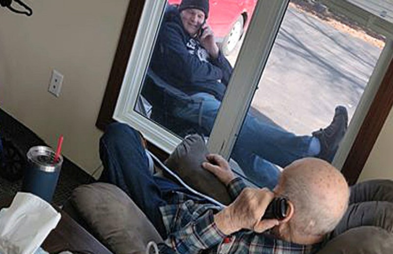 इस तस्वीर को Sandy Hamilton नाम के शख्स ने फेसबुक पर शेयर किया है। उन्होंने तस्वीर शेयर करते हुए बता कि बुजुर्ग पिता ने कोरोना वायरस से बचने के लिए खुद को घर में लॉकडाउन (lockdown) कर लिया गया है। उसका बेटा उससे रोज मिलने आता है। दोनों एक शीशे एक दिवार के आर पार बैठते हैं। और एक दूसरे से फोन पर बात करते हैं।