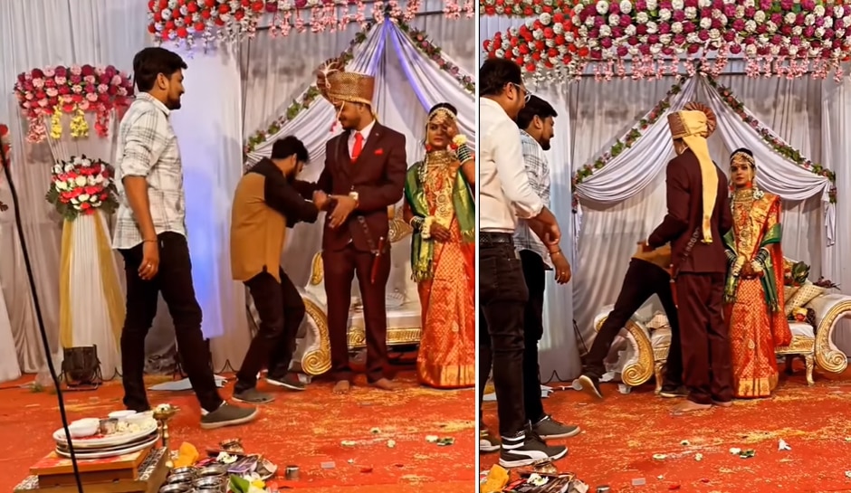 इंटरनेट पर वायरल होने वाले इस वीडियो में दिखाई दे रहा है कि जब दूल्हा और दुल्हन स्टेज पर खड़े हुए होते हैं तो दूल्हे के सभी दोस्त अजीब मजाक कर बैठते हैं। दरअसल जैसे ही दूल्हा और दुल्हन मेहमानों के साथ फोटोग्राफ खिंचवा रहे होते हैं, तो तभी दूल्हे के कुछ दोस्त स्टेज पर आ धमकते हैं और फिर वह सोफे पर रखे हुए बुके को उठा लेते हैं। इस बुके को वे वहीं खड़े दूल्हे को गिफ्ट में दे देते हैं।