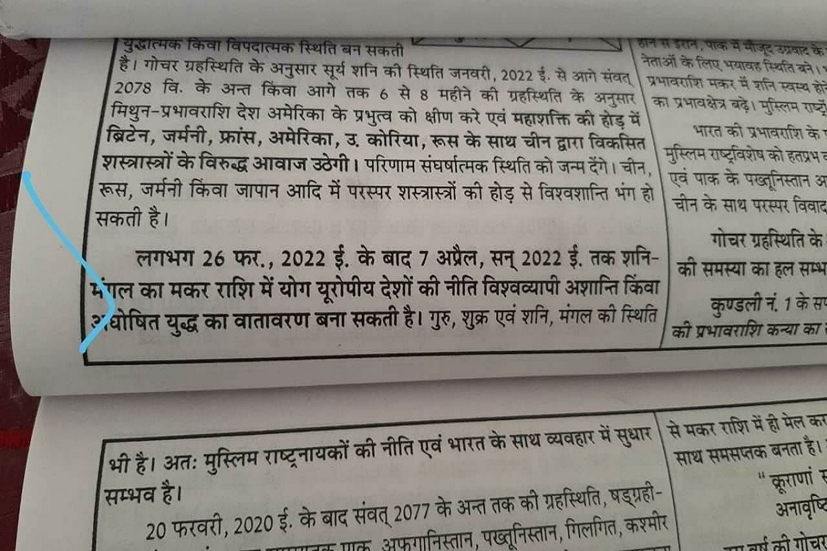 आखिर इस पंचांग में क्या लिखा है? और ये कौनसी पंचांग है जिसने इतने बड़े युद्ध की भविष्यवाणी कर दी। दरअसल ये भारतीय कैलेंडर किशोर जंत्री 2022 है जिसकी तस्वीरें सोशल मीडिया पर वायरल हो रही हैं। कहा जा रहा है कि इसमें पहले ही लिखा था कि 26 फरवरी वर्ष 2022 से 7 अप्रैल 2022 तक शनि मंगल का मकर राशि में योग बन रहा है। जिसके तहत यूरोपिय देशों की नीति विश्वव्यापी अशांति की वजह बन सकती है। यह स्थिति अघोषित युद्ध का वातारण बना सकती है।