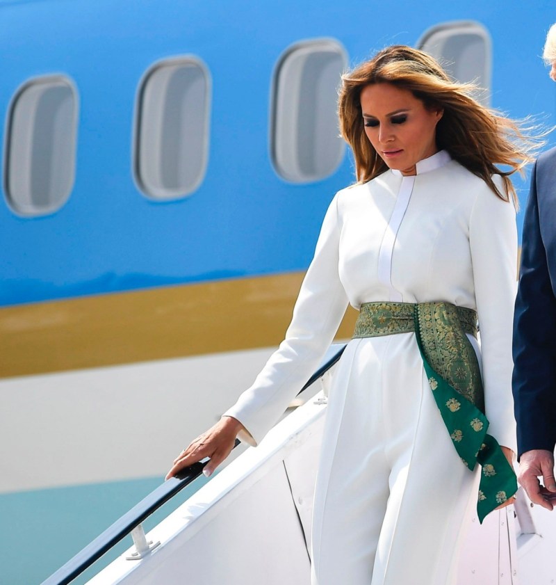 मेलानिया के व्हाइट कलर की स्टैलेटोज को भारतीय टच देने के लिए ग्रीन चौड़े बेल्ट को शामिल किया गया। डोनाल्ड ट्रंप की पत्नी ने विदेशी ड्रेस में मुगलकालीन शैली को शामिल कर इसे फ्यूजन टच दिया। ये उनकी ड्रेस की खूबसूरती में और भी ज्यादा चार चांद लगा रहा था। मेलानिया ने डोनाल्ड ट्रंप के साथ हाथों में हाथ डालकर पूरे ताजमहल में चहल-कदमी की।
