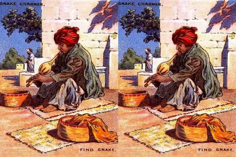 ऐसी तस्वीरों को सॉल्व करने में बाज की नजर वाले भी सांप को खोजने में जल्दी कामयाब नहीं हो पाएंगे। अगर आप भी खुद को जीनियस समझते हैं तो एक कोशिश कर लीजिए। 10 सेकंड के अंदर तस्वीर में छिपे सांप को खोजकर दिखाए। बता दें, ये तस्वीर 1880 के दशक की है। इस तस्वीर को इस तरह से बनाया गया है कि सपेरा तो बीन बजाते दिखाई दे रहा है, मगर सांप भी सामने होने के बावजूद दिखाई नहीं दे रहा। अब तक 1% लोग ही इस तस्वीर में सांप ढूंढने में सफल हो पाए हैं।