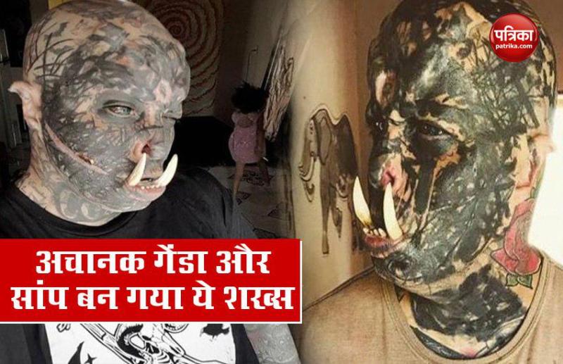 नई दिल्ली। शौक बड़ी चीज होती है। इस दुनिया में कई ऐसे लोग है जो अपने अजीबोगरीब शौक के लिए जाने जाते है। ये अपने शौक को पूरा करने के लिए किसी भी हद से गुजारने के लिए हमेशा तैयार रहते है। कुछ लोगों को अपने शरीर पर नाम गुदवाते है और टैटू भी बनवाते है। कुछ इतने टैटू बनवाते है कि उनका पूरा शरीर ही ढक जाता है। आज आपको एक ऐसे शख्स के बारे में बता रहे है जिसने अपने बॉडी पर 80 प्रतिशत हिस्से पर टैटू बना रखे है। इसके बाद भी यह बंदा संतुष्ट नहीं हुआ। आपको यह जानकर हैरान होगी कि उसने ना सिर्फ अपने जीभ को दो भाग में कटवा लिया। इतना नहीं उन्होंने गेंडे की तरह अपने दो दांत को उगा लिए।