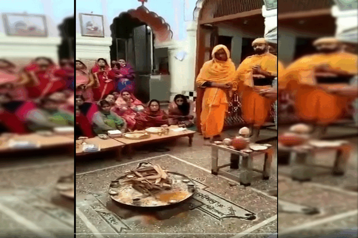 इंटरनेट पर वायरल हो रहे एक वीडियो में किसी घर में कोई मांगलिक कार्य हो रहा है। वहां पर हवन की तैयारी चल रही है। घर पर बहुत से लोग नजर आ रहे है। कुछ पंडित भी वहां मौजूद हैं। घर के आंगन के बीच में हवन कुंड बना हुआ है। जिसमें कुछ लकड़ियां रखी हुई हैं। थोड़ी दूरी पर पंडित खड़े हैं। वहीं मुख्य पंडित उस हवन कुंड में कुछ सामग्री डाल रहे हैं और मंत्रों का उच्चरण कर रहे हैं।