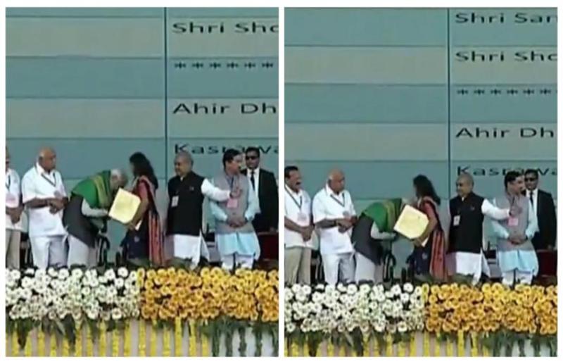 दरअसल ये तस्वीर कर्नाटक (karnataka) के तुमकुर में आयोजित एक कार्यक्रम की है। जिसमें पीएम मोदी अवॉर्ड पाने वाली एक महिला के पैरों में झुक गए। बताया जाता है कि महिला अवॉर्ड लेने के बाद पीएम के पैर छूने जा रही थीं तभी मोदी ने उन्हें रोकते हुए खुद उनके पैर छूने लगे। ये देख महिला थोड़ी भावुक हो गईं। महिला का नाम कंचन वर्मा है।
