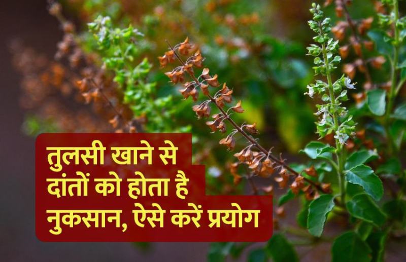 दरअसल तुलसी के पत्ते में भारी मात्रा में आयरन और मर्करी (पारा) पाया जाता है। तुलसी के पत्ते को चबाने पर ये तत्व हमारे मुंह में घुल जाते हैं। ये दोनों ही तत्व हमारे दांतों की सेहत और उनकी सुंदरता के लिए नुकसानदेह हैं। तुलसी थोड़ी अमलीय यानी कि एसिडिक नेचर की होती है, इसलिए रोजाना इसका सेवन दांतों की तकलीफों को बढ़ा सकता है। हालांकि तुलसी का ताजा रस मुंह के अल्सर के लिए काफी फायदेमंद होता है लेकिन फिर भी तुलसी के पत्ते को चबाने से मना किया जाता है। तुलसी की तासीर गरम होती है और गरम प्रवृति के लोगों को इसका उपयोग डॉक्टर की सलाह से करना चाहिए।