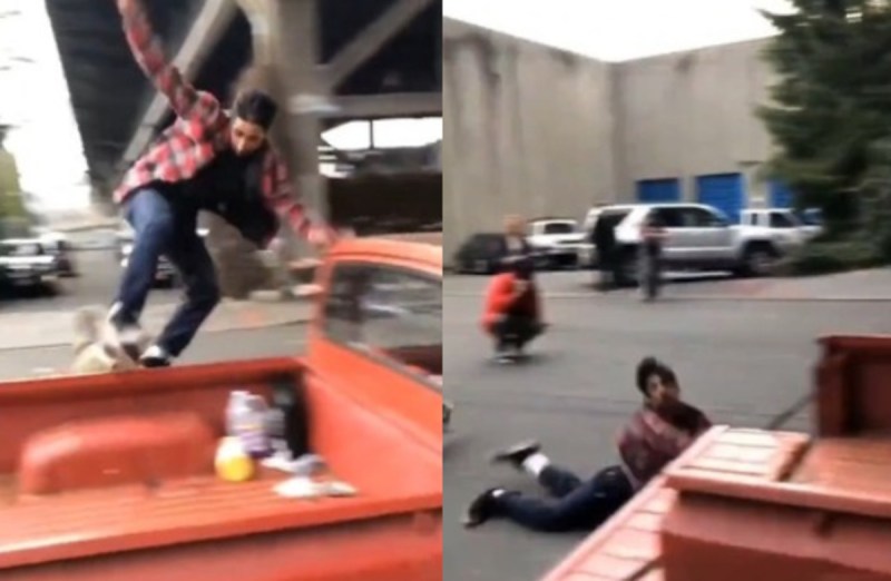स्केटबोर्ड जंप कराते हुआ लड़का साइड में खड़े पिकअप के पिछले हिस्से से टकरा जाता है। लड़के का मुंह पिकअप ट्रक के पिछले हिस्से से टकराता है। ऐसा होते ही लड़का सड़क पर ही गिर जाता है और दर्द से कराह उठता है।